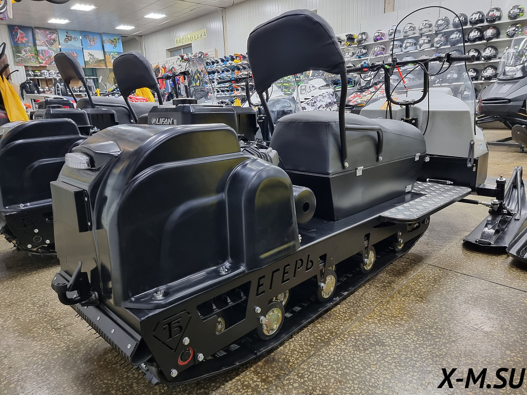 Модель на базе стандартной гусеницы Бурлак Егерь СТАНДАРТ. На миниснегоход установлено полутора местное сиденье снегоходного типа.