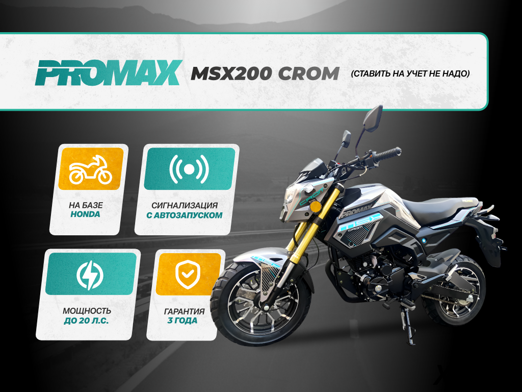 PROMAX MSX200 CROM (49) - мой новый любимый транспорт! До этого ездил на скутере, небо и земля! Мощность бомба, динамика отличная. Рама из хромомолибдена - чувствуется надежность. Подвеска Italin - мягкая и комфортная, даже на неровностях. Правда, сначало пришлось немного подтянуть болты, мелочи. А в остальном - всё супер! Очень доволен покупкой. Рекомендую всем, кто ищет надёжный и стильный мотоцикл.